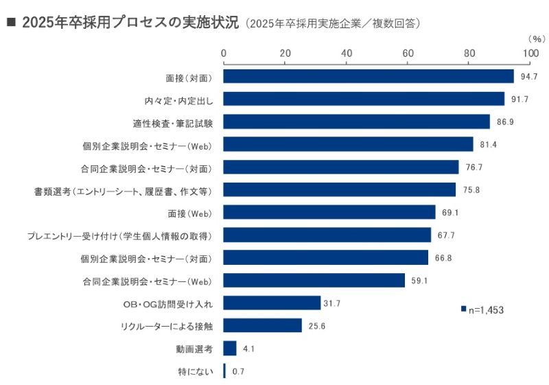 リクルートキャリアが行った2025年の学生を対象にした採用プロセスの実施状況の調査によると、書類選考の実施率は75.8%でした。
