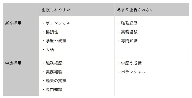 上記の表の通り、新卒採用は主に学生がターゲットなため、仕事に対する姿勢や人柄を中心に判断する傾向があります。